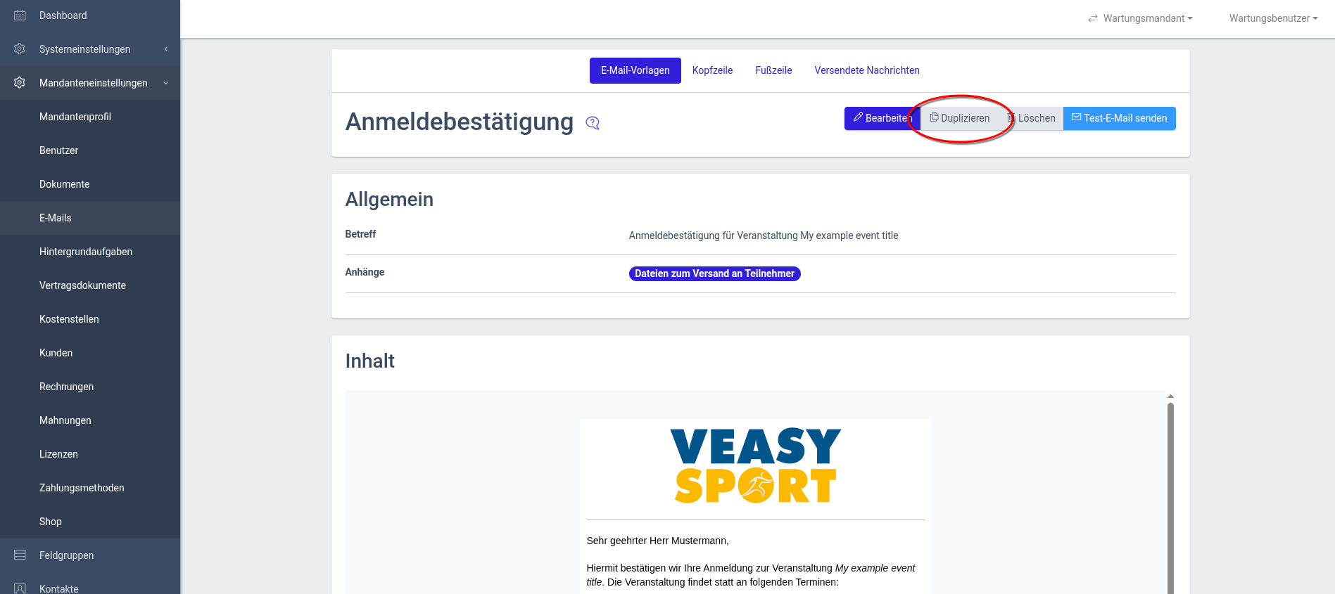 In der Detailansicht der E-Mail-Vorlage führen Sie die Aktion Duplizieren aus, um die gewählte