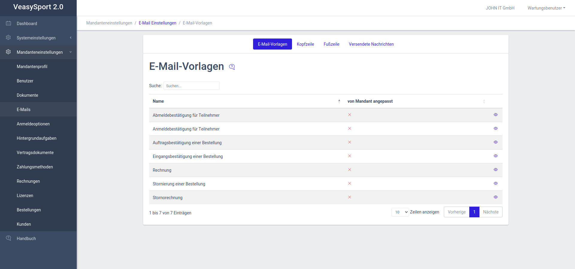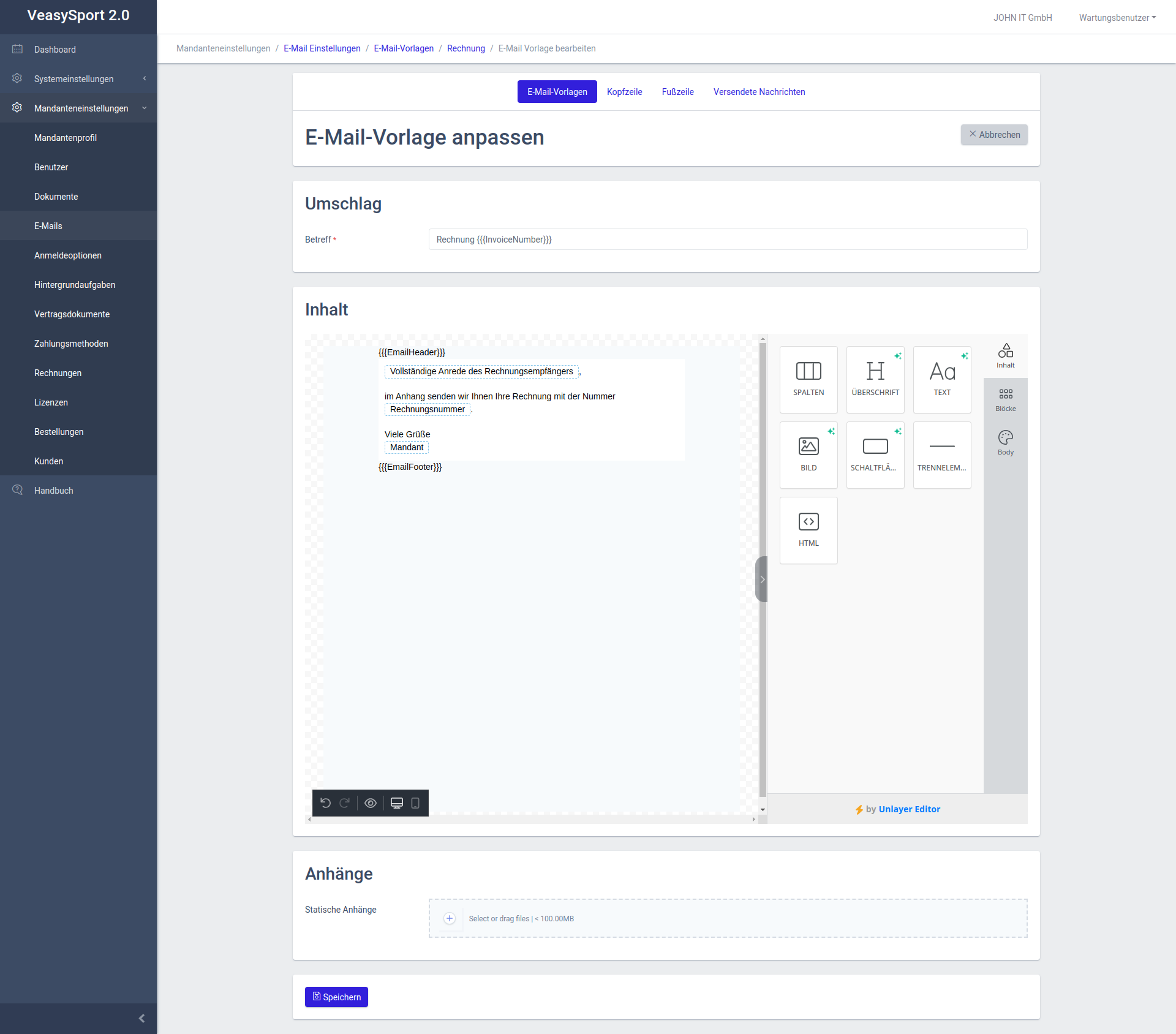 Alle E-Mails sind in einer Standardkonfiguration mit einem Standardinhalt vorhanden. Jeder Mandant kann die Konfiguration und den Inhalt seiner E-Mails individuell anpassen. Hierzu steht ein Editor mir umfangreichen Optionen zu Verfügung:
