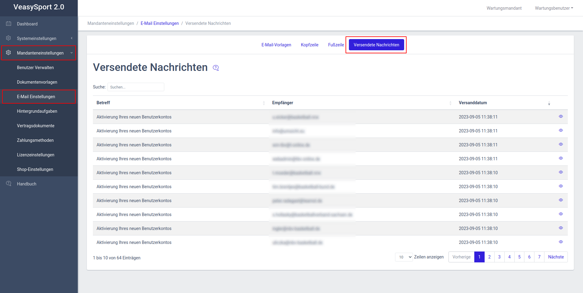 In der Versendete Nachrichtenverwaltung der Einstellungen sind alle Versendete Nachrichtenen eines Mandanten aufgelistet. Versendete Nachrichtenen stellen den gesamten Email Ausgang dar. Dies umfasst vom System versendete, sowie von ihnen manuell angestoßene Mails.