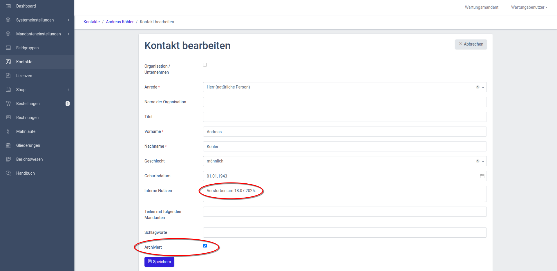 Sie können einen Kontakt archivieren. Dies ist hilfreich, wenn ein Kontakt verstorben ist oder aus anderen Gründen nicht mehr verwendet werden soll.