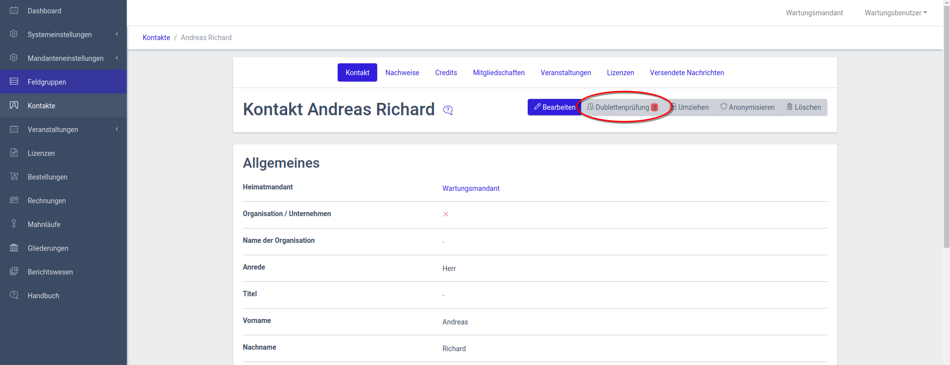 Stellt das System fest, dass ein neuer Kontakt bereits im System existiert, werden Sie nach dem Anlegen des Kontakts aufgefordert die Dubletten zusammenzuführen sodass jeder Kontakt nur einmal im System existiert.
