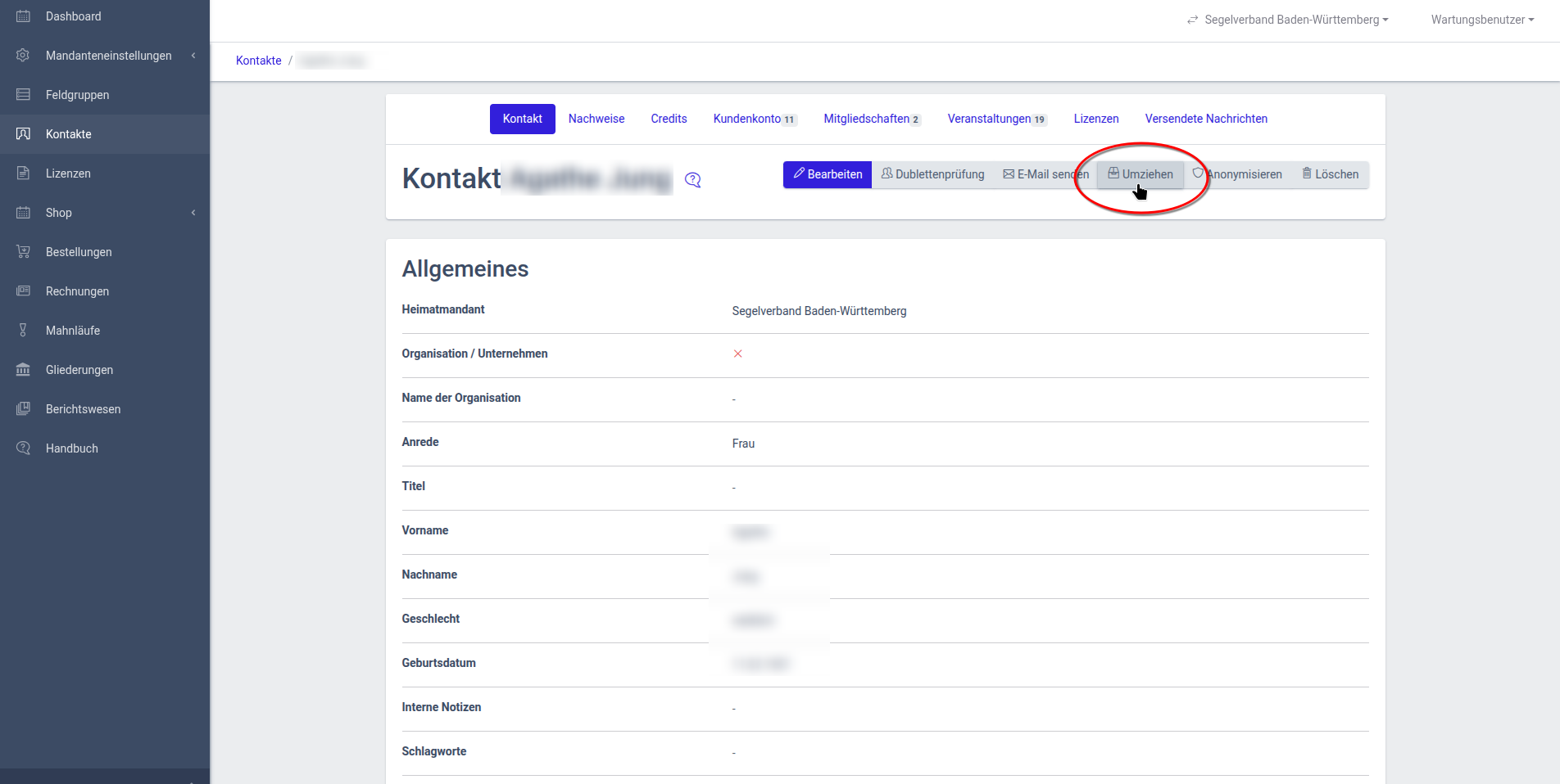 Sie können Kontakte Ihres eigenen Mandanten in einen anderen Verband umziehen.
