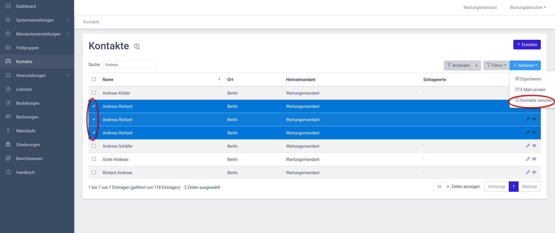 Wenn ein Kontakt mehrfach im System existiert, können Sie diese zu einem Kontakt verschmelzen.