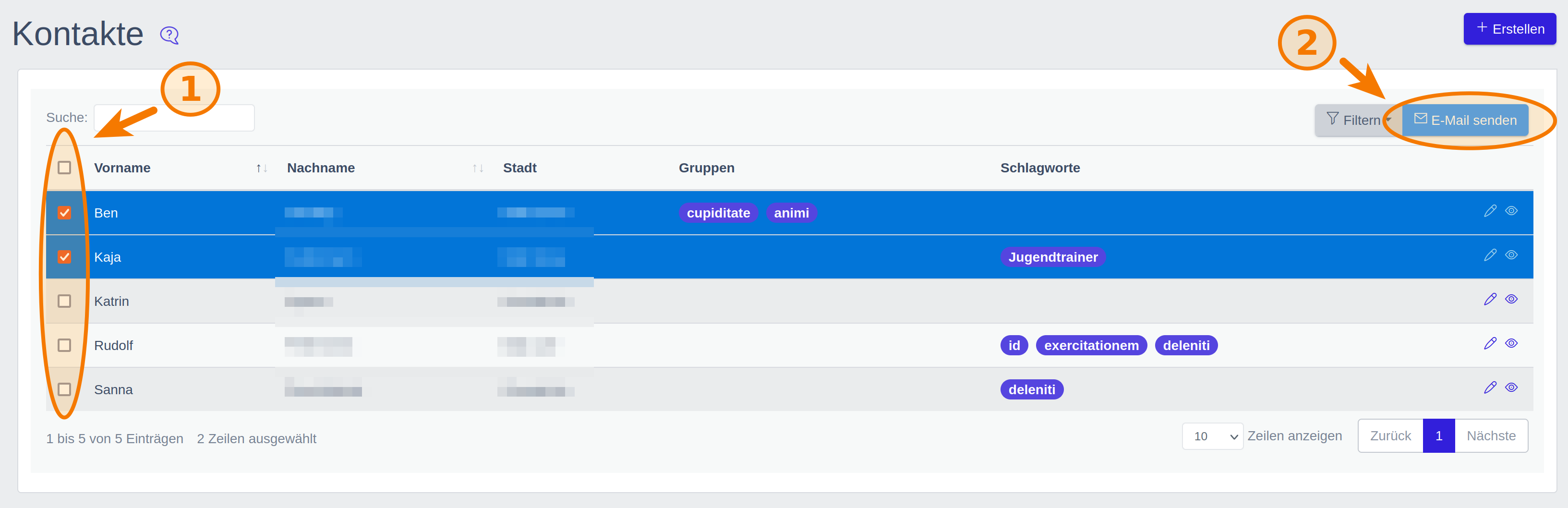 Sie haben die Möglichkeit Kontakten eine E-Mail zu senden. Zuerst wählen Sie über die Checkboxen alle Kontakte aus denen Sie eine Email schreiben möchten. Danach klicken sie auf den Button E-Mail senden.