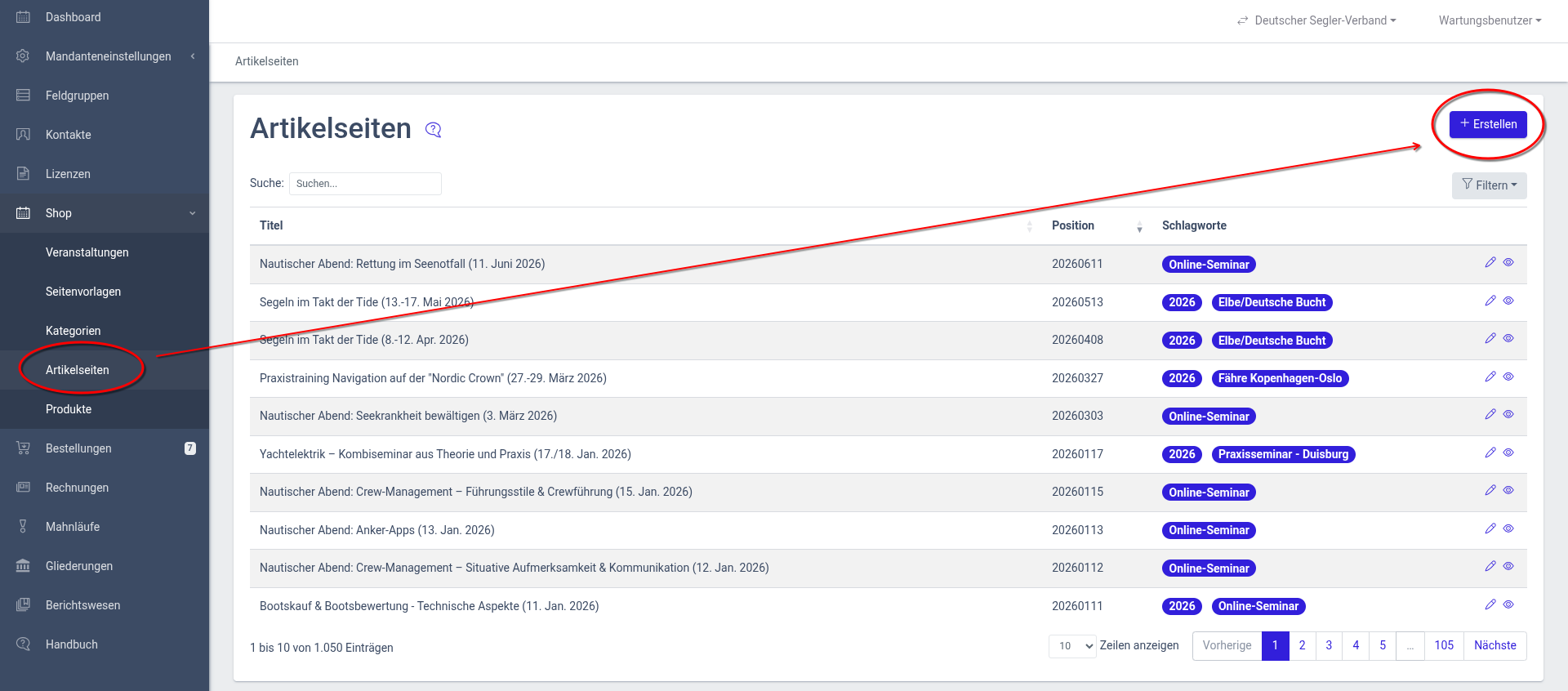 Standardmäßig werden Artikelseiten im Shop aufsteigend nach ihrem Titel sortiert. In einigen Fällen kann es jedoch sinnvoll sein, eine eigene Sortierung anzugeben. Bei Veranstaltungen könnte dies bspw. die Sortierung nach Veranstaltungsdatum sein, wie im obigen Bild gezeigt.