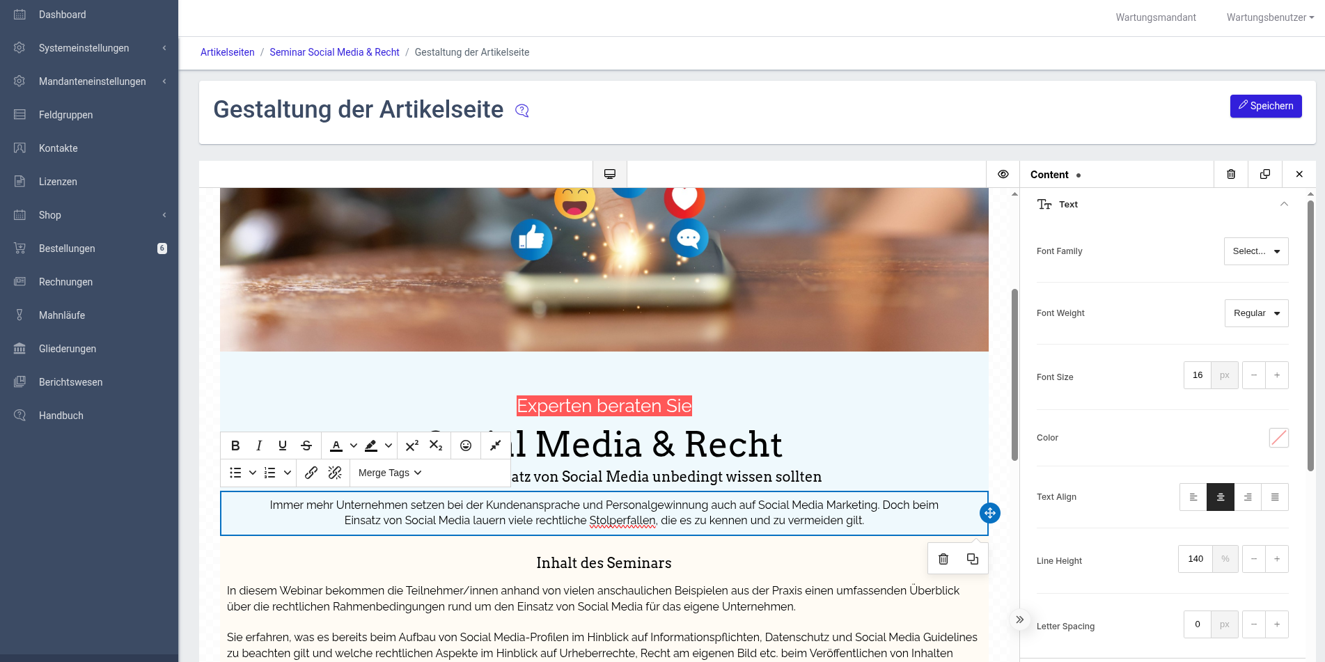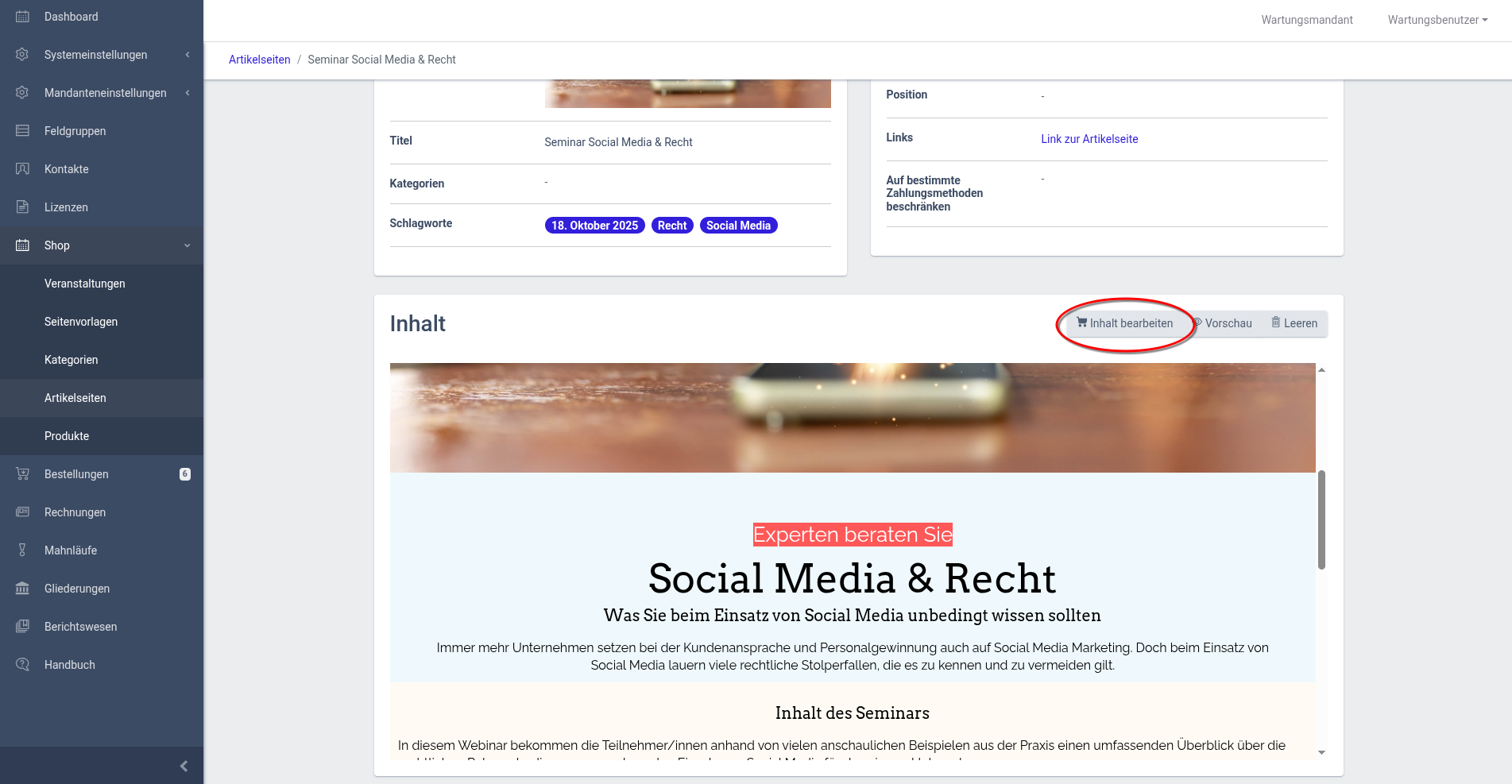 Um den Inhalt einer Artikelseite zu gestalten rufen Sie die Artikelseite auf und scrollen Sie zum Abschnitt Inhalt. Klicken Sie dort auf den Button Inhalt bearbeiten aus. Es öffnet sich ein Editor mit umfangreichen Gestaltungsoptionen.
