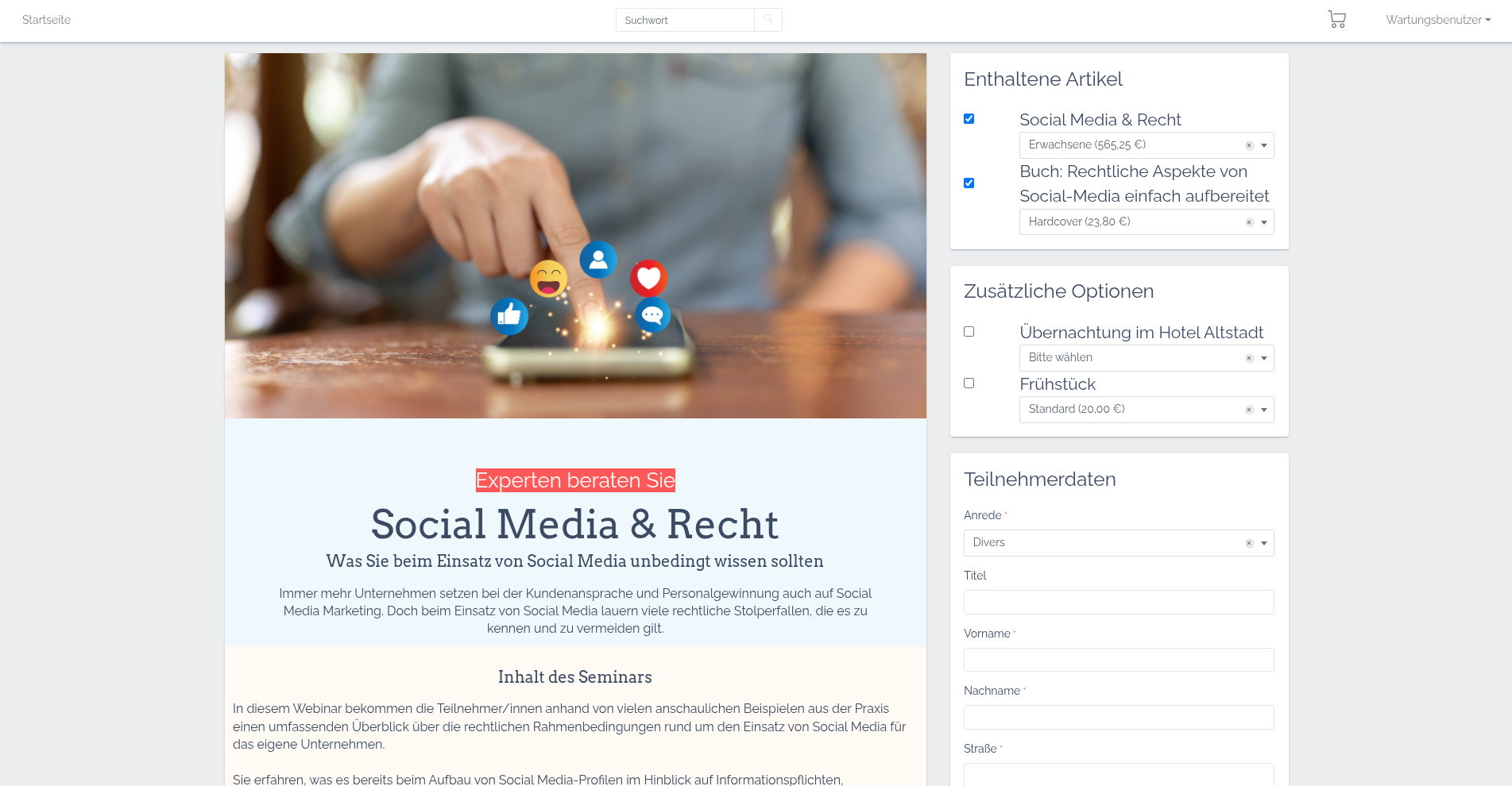 Eine Artikelseite kann entweder einen einzelnen Artikel (Veranstaltung, Produkt o.Ä.) oder mehrere Artikel in Kombination enthalten (Bündelangebot).