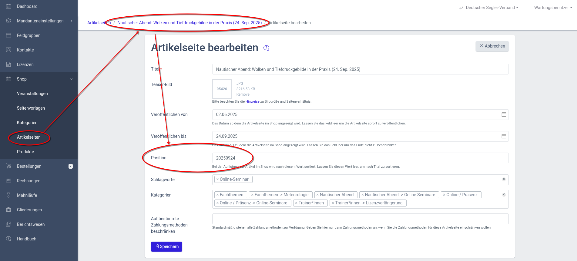 Hierzu verwenden Sie das Feld Position auf der Artikelseite: