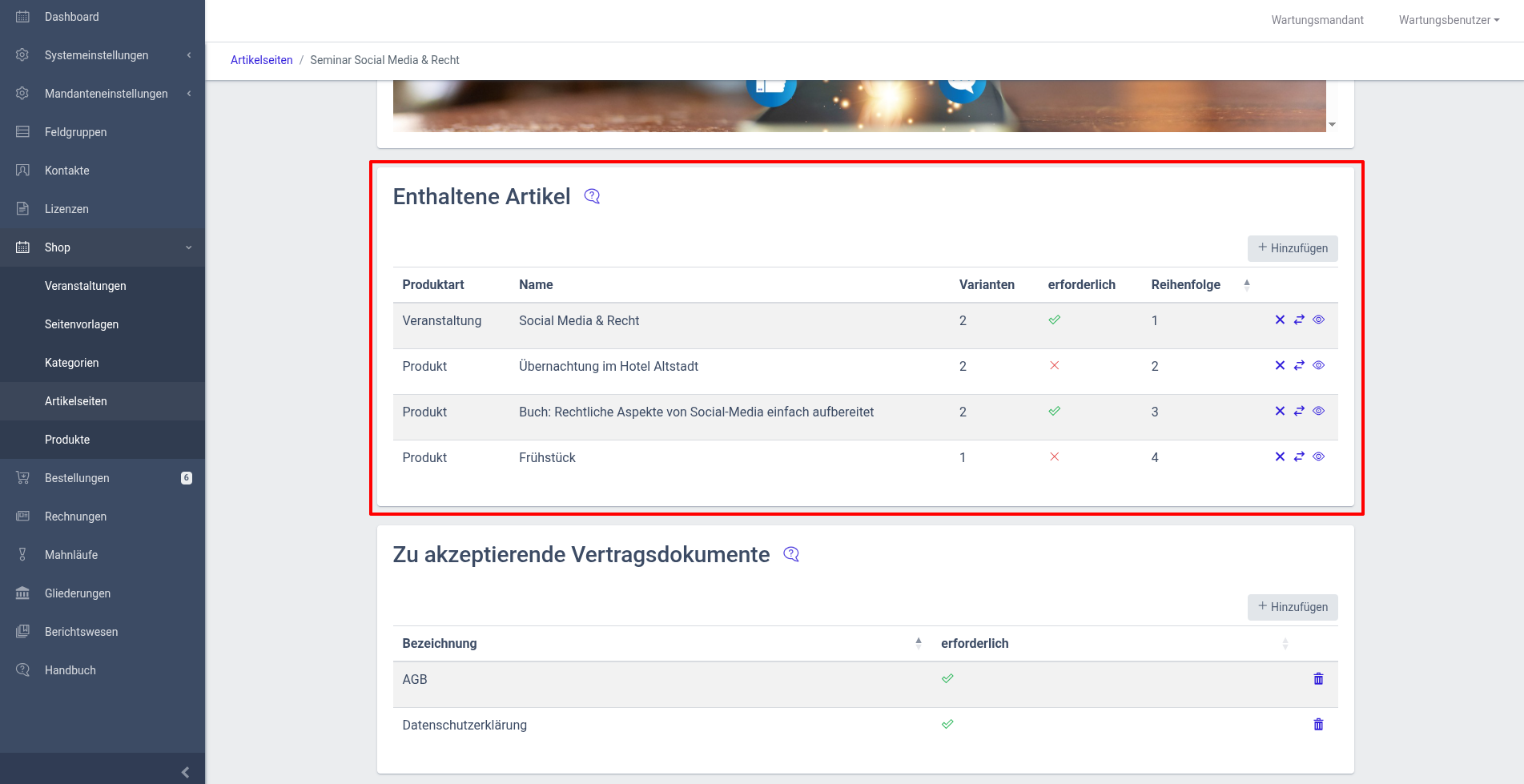 Um die enthaltenen Artikel zu konfigurieren, rufen Sie die Artikelseite auf und scrollen Sie zum Abschnitt Enthaltene Artikel. Dort können Sie: